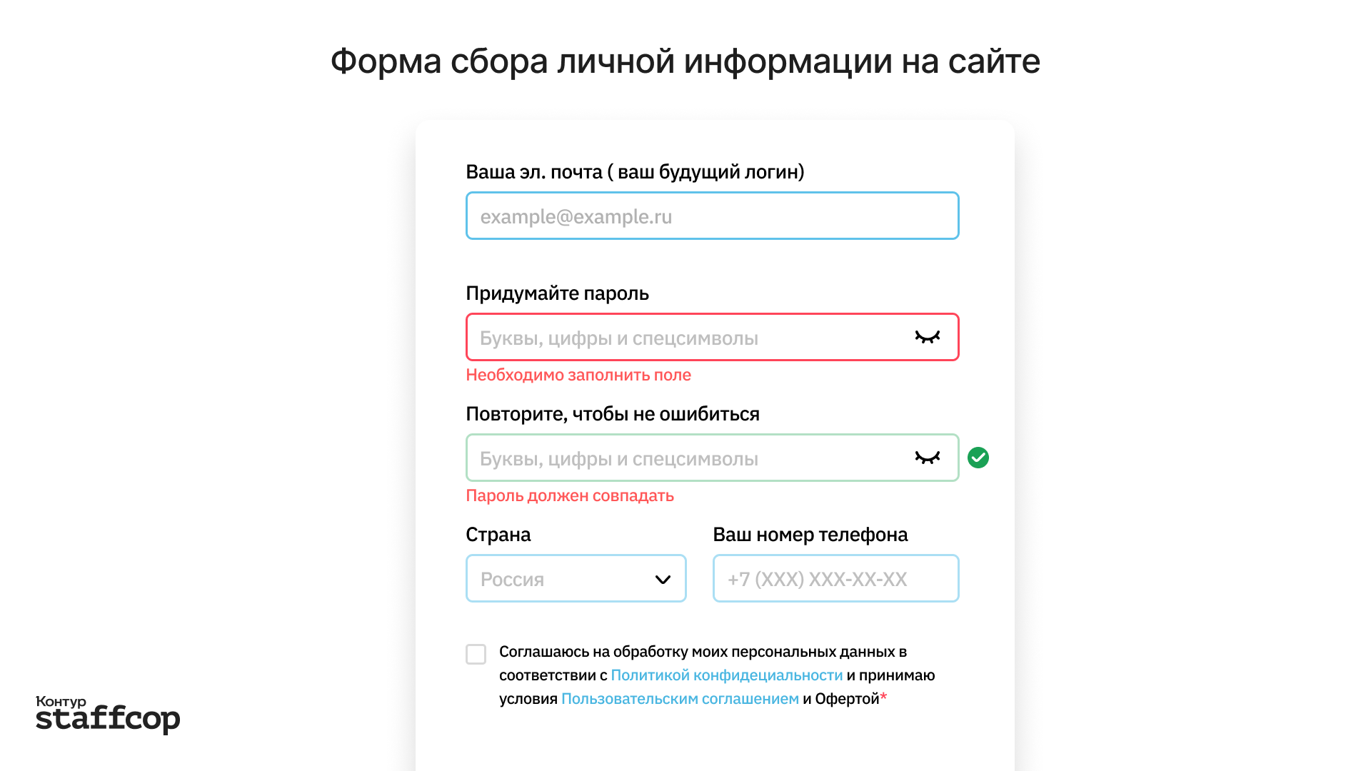 На странице, где собирается личная информация, должны быть ссылки на эти документы и чек-боксы. Пользователь ставит галочку, если согласен предоставить личные сведения.