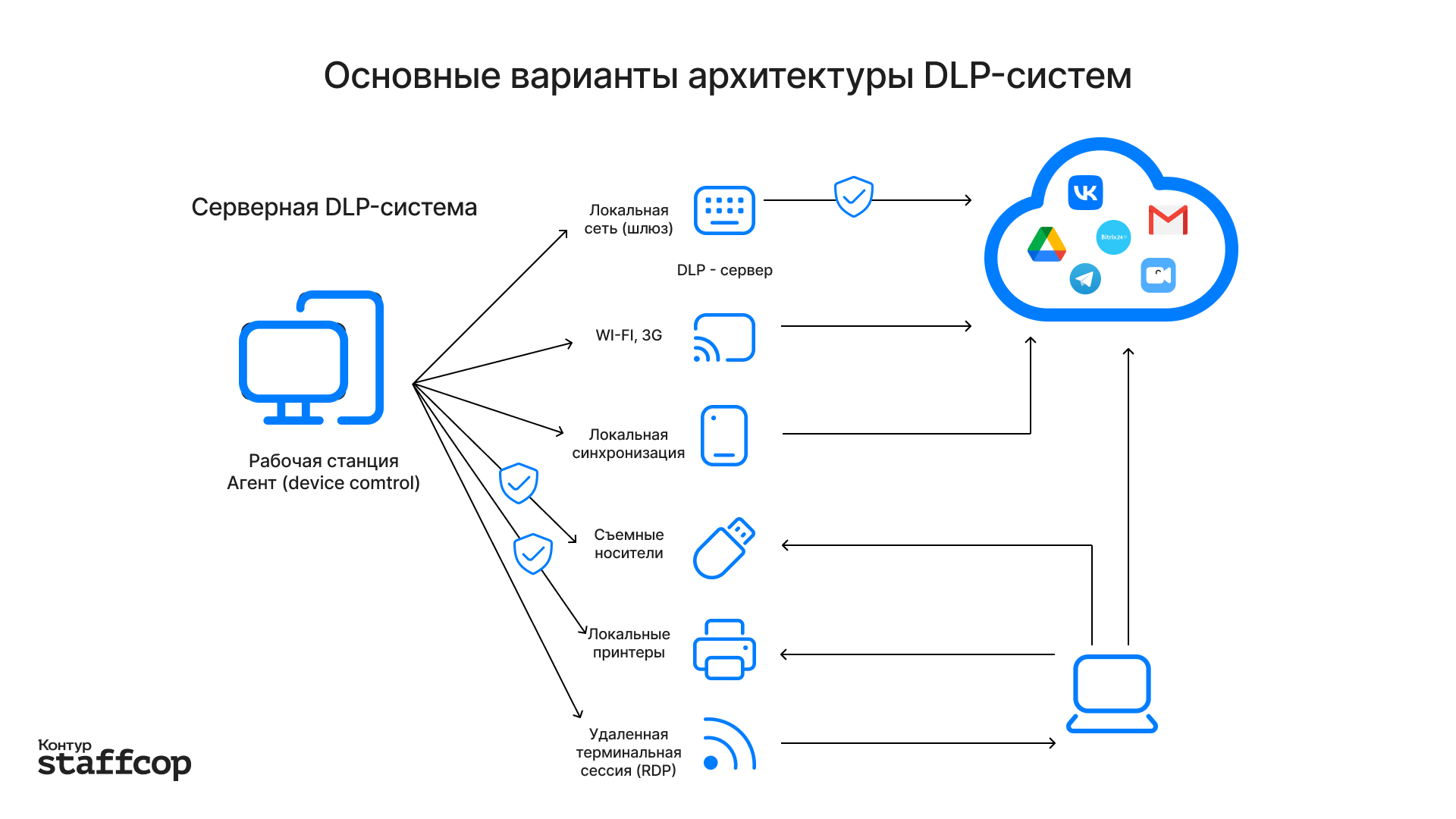 DLP-модуль можно установить на любые рабочие машины независимо от местоположения сервера. Даже если пользователь работает с удаленного устройства, система контролирует его действия и блокирует доступ к данным по установленным правилам.