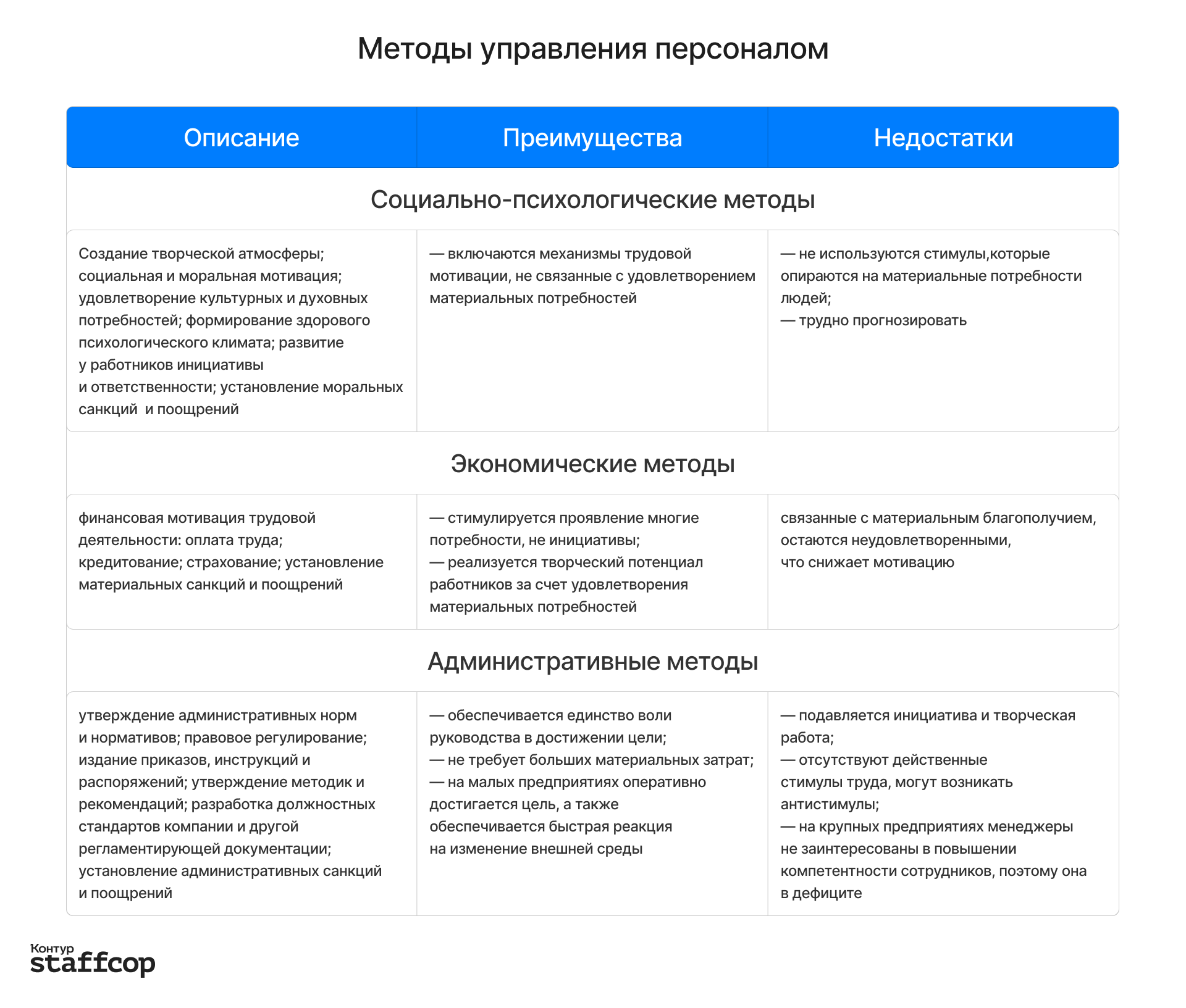 Методы управления персоналом — это способы, которые помогают наладить работу сотрудников, повысить их продуктивность и мотивацию. А когда команда хорошо работает, то и компания быстрее достигает бизнес-целей.