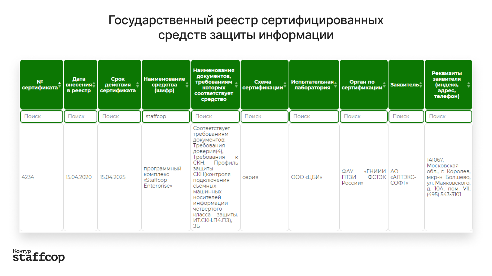 Программный комплекс Staffcop Enterprise получил сертификат ФСТЭК № 4234 от 15 апреля 2020 года, переоформленный 4 июля 2022 года. Сервис может быть интегрирован в автоматизированные системы (АС) с уровнем защиты до 1Г, информационные системы персональных данных (ИСПДн) и государственные информационные системы (ГИС).